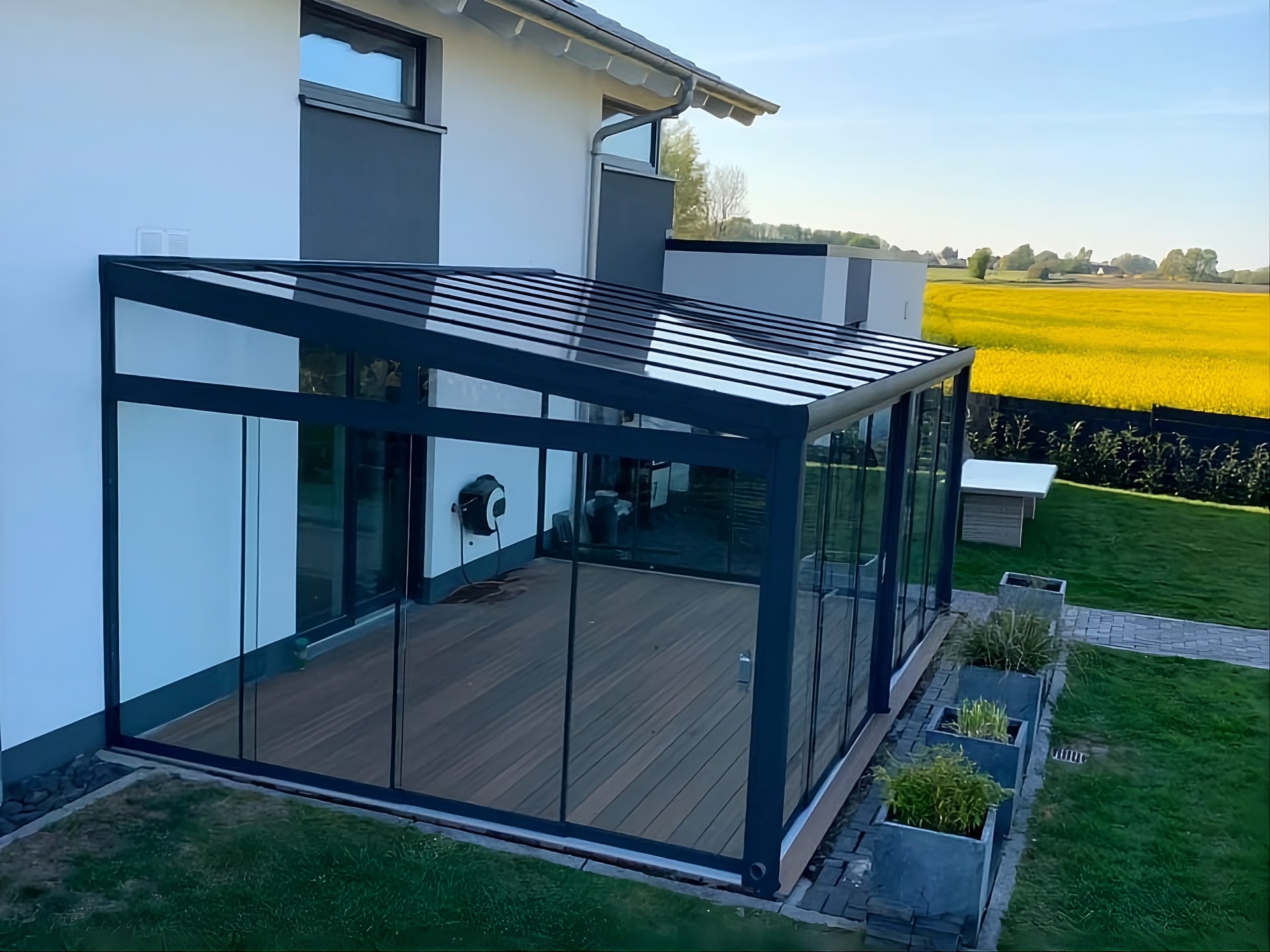 Posuvné zasklení je ideálním doplňkem pergoly, pokud chcete svou terasu využívat od jara až do podzimu – a v některých případech i v zimě. Chrání před větrem, deštěm i hlukem z okolí a zároveň zachovává dostatek světla a otevřený prostor.